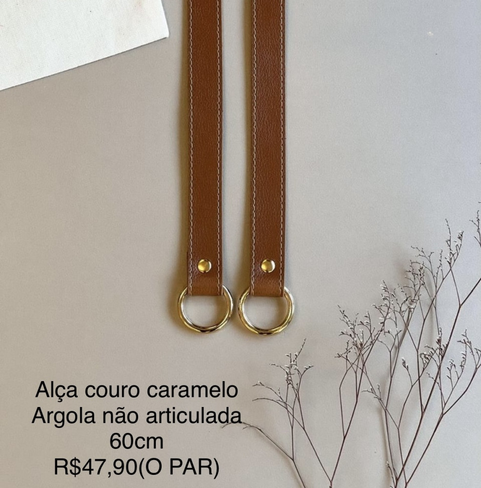 Alça Couro Caramelo com argolas NÃO ARTICULADAS- 60 cmVENDIDAS NO PAR!