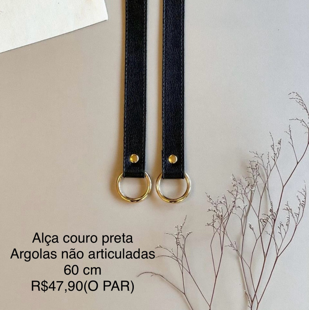 Alça couro preta argolas NÃO ARTICULADAS - 60 cm - O PAR