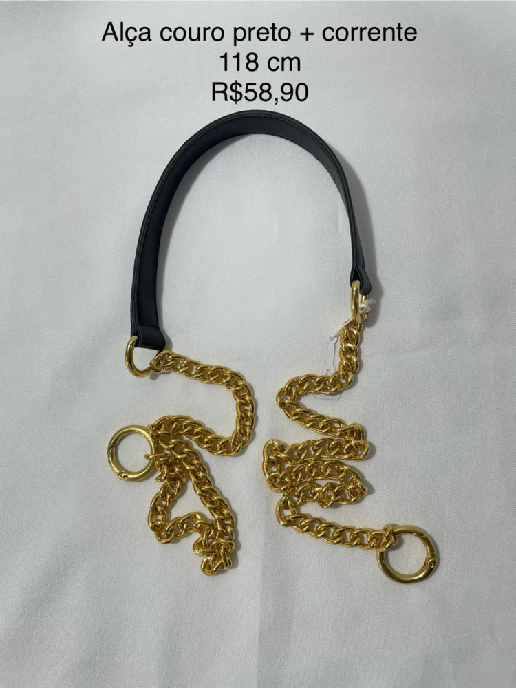 Alça Couro Preto + corrente e argolas articuladas douradas