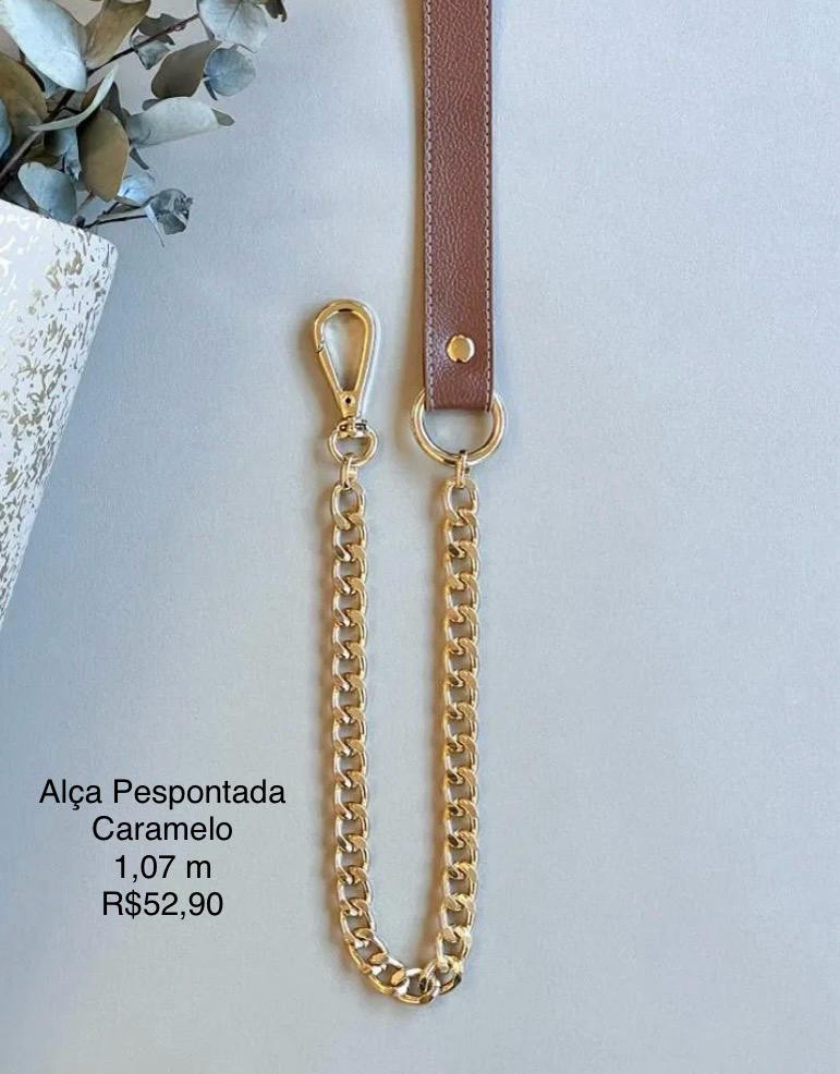 Cor: CarameloMateriais: Sintético Pespontado, Corrente de Alumínio e Mosquetões Metálicos.