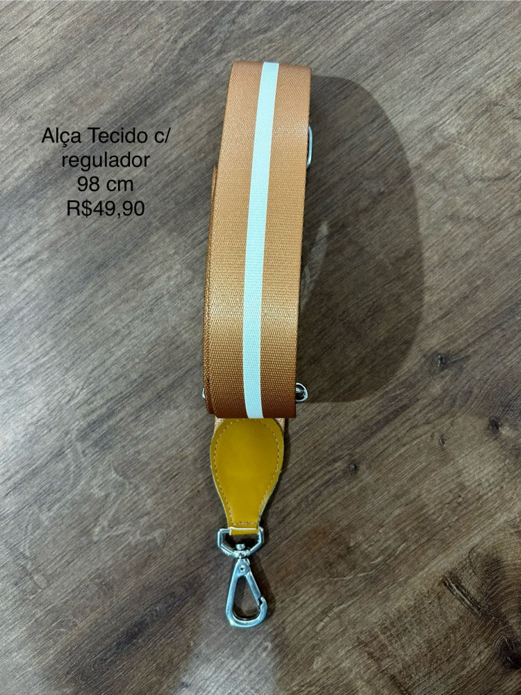 Alça de Tecido c/ regulador Caramelo e Listra Branca - Metal Niquelado