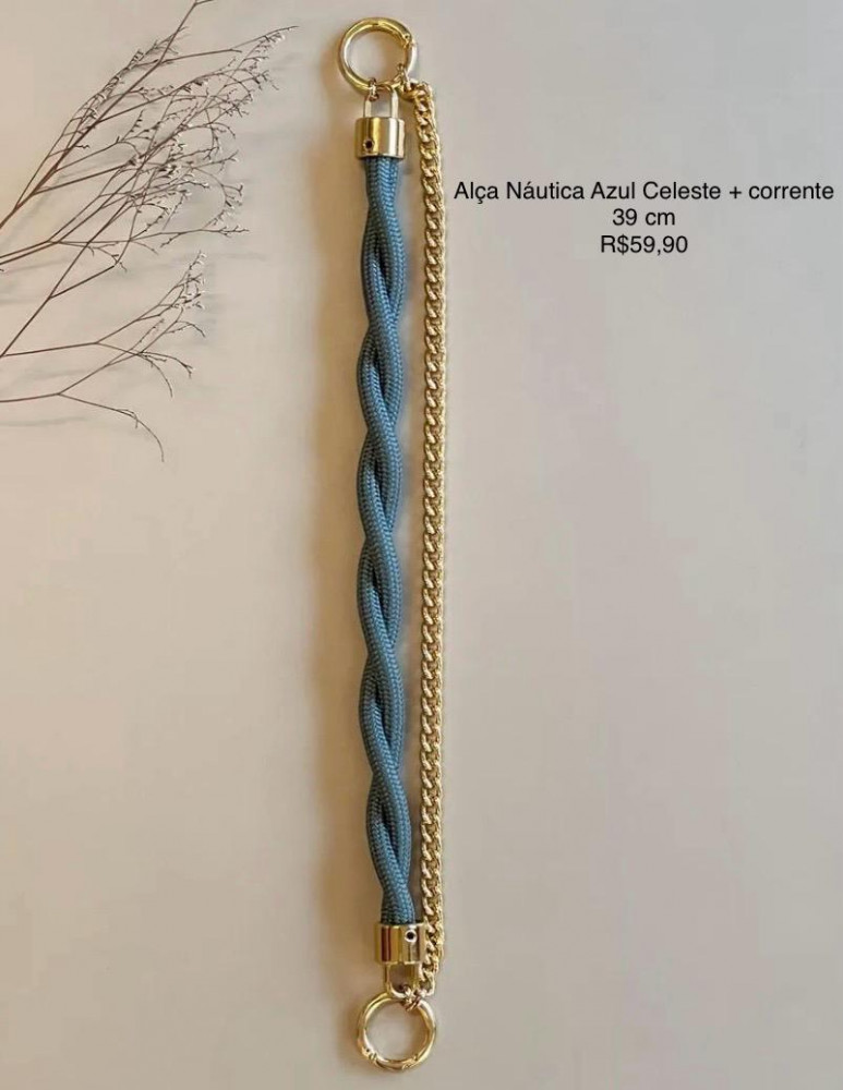 Comprimento da alça com as argolas: Aproximadamente 39cm.Argolas articuladas douradas